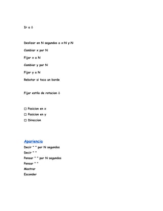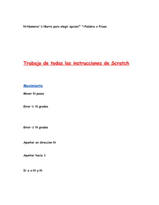 Este documento proporciona una lista de instrucciones y bloques de Scratch, incluyendo bloques para el movimiento, apariencia, sonido, lapiz, datos, eventos, control, sensores y operadores matemáticos. Describe funciones como mover, girar, cambiar disfraces y fondos, tocar sonidos, crear variables y bucles, y realizar operaciones matemáticas.