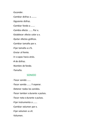 Este documento proporciona instrucciones para el uso de bloques de programación en Scratch, incluyendo bloques para movimiento, apariencia, sonido, lápiz, datos, eventos, control, sensores y operadores. Permite controlar la posición, dirección, disfraces y fondo de los objetos, y agregar funcionalidad como sonido, interacción y lógica de programación.