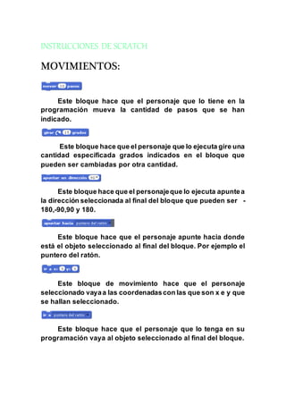 Este documento proporciona instrucciones sobre los diferentes bloques de Scratch, incluyendo bloques de movimiento, apariencia, sonidos, eventos, control y sensores. Explica lo que cada bloque hace, como mover un personaje una cantidad de pasos, cambiar su disfraz, reproducir un sonido, repetir bloques, y detectar cuando se presiona una tecla o se toca un objeto.