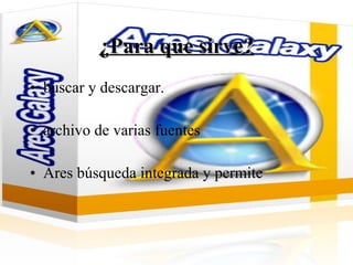 Ares es un programa gratuito para buscar y descargar archivos de audio, video y otros formatos de varias fuentes. Se puede descargar de la página web de Softonic de forma rápida y segura. Una vez descargado e instalado, el usuario puede buscar archivos, conectarse a la red Ares y descargar los resultados de la búsqueda.