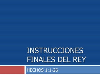 Este documento resume los eventos entre la ascensión de Jesús al cielo y la elección de Matías como el nuevo apóstol para reemplazar a Judas. Los discípulos regresaron a Jerusalén y se reunieron para orar. Pedro dirigió la reunión y citó las Escrituras para mostrar que Judas había traicionado a Jesús. Luego, los discípulos eligieron a José y Matías y dejaron la decisión final en manos de Dios mediante el lanzamiento de suertes.