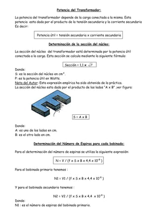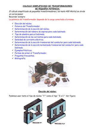 Este documento presenta un método simplificado para calcular transformadores de pequeña potencia de hasta 400 Watts. Explica los pasos a seguir, que incluyen elegir el núcleo apropiado, determinar la potencia, sección del núcleo, número de espiras, tipo de alambre, corrientes, sección transversal del conductor y más. Proporciona fórmulas clave y ejemplos prácticos para ilustrar el proceso de cálculo de transformadores.