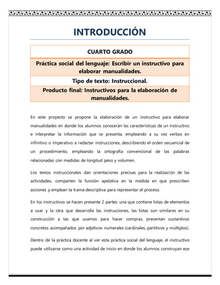 Este documento propone la elaboración de instructivos para manualidades por parte de estudiantes de cuarto grado. Los instructivos describirán el proceso secuencial para realizar una manualidad usando verbos en infinitivo o imperativo y con la ortografía adecuada. Los estudiantes aprenderán las características de los instructivos y cómo interpretar la información presentada.