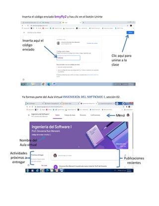 Este documento proporciona instrucciones para unirse al Aula Virtual de Ingeniería del Software I. Los estudiantes pueden unirse al aula a través de un enlace o la aplicación Classroom de Google ingresando el código de clase bmyfly2. Una vez dentro, los estudiantes podrán acceder a la información general del curso, las unidades temáticas, actividades, tareas y evaluaciones asignadas. Cualquier duda se puede consultar con la profesora a través de correo electrónico o Telegram.