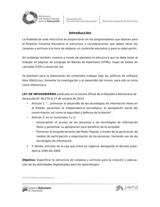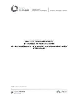 El documento proporciona instrucciones para programadores que desarrollan actividades digitalizadas educativas. Detalla la estructura de carpetas y archivos requerida, incluyendo carpetas para actividades, audio, guiones, imágenes, páginas, presentación, script y video. También especifica consideraciones como usar solo caracteres alfanuméricos en nombres, comentar código, y seguir estándares de software libre.