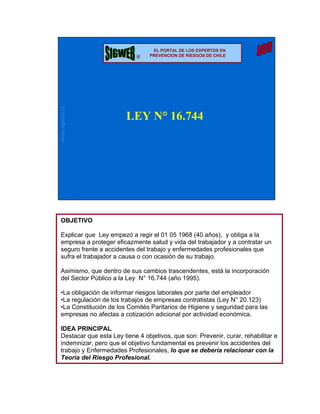 Este documento resume la Ley 16.744 de seguros contra riesgos de accidentes del trabajo y enfermedades profesionales en Chile. Explica que la ley obliga a las empresas a proteger la salud y vida de los trabajadores y contratar un seguro. También describe las obligaciones de empresas y trabajadores, así como aspectos clave como los comités paritarios de higiene y seguridad y el reglamento interno de orden, higiene y seguridad.