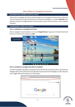 Este documento proporciona instrucciones sobre cómo usar un navegador de Internet. Explica cómo acceder a un navegador, navegar a páginas web ingresando las URLs, e identificar los botones principales como "Adelante" y "Atrás". También describe cómo personalizar el navegador agregando páginas a los marcadores para acceder a ellas fácilmente en el futuro. Finalmente, recomienda el uso del navegador para buscar información y su importancia en la enseñanza.