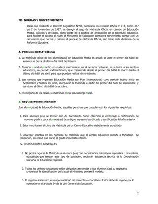El documento establece las normas y procedimientos para la matrícula oficial en centros de educación media en El Salvador. Se especifica que la matrícula es anual y gratuita, abriéndose del 1 de enero al 28 de febrero, aunque hay un período extraordinario de marzo a abril. Los centros deben aceptar a todos los estudiantes que cumplan los requisitos de haber completado el grado anterior y estar inscritos en el libro de matrícula. El registro académico es responsabilidad de cada centro.