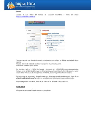 El documento proporciona instrucciones para acceder y navegar por el aula virtual del Cursillo de Integración al Uruguay. Explica cómo iniciar sesión con el número de cédula de identidad o pasaporte, y describe las diferentes secciones del aula como los foros, materiales y actividades de cada asignatura. También resume los pasos para completar con éxito el curso, incluyendo la participación requerida en los foros y la entrega de una evaluación final.