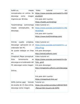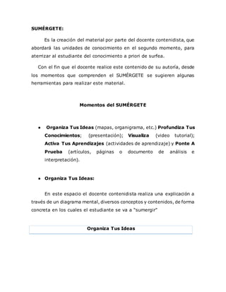 Este documento proporciona instrucciones para que los docentes creen material didáctico para estudiantes en modalidad virtual. Explica las diferentes secciones que deben incluirse como "Organiza tus ideas", "Profundiza tus conocimientos", "Visualiza", "Activa tus aprendizajes" y "Ponte a prueba". También recomienda herramientas como mapas conceptuales, presentaciones y videos tutoriales para cada sección y proporciona pasos a seguir para crear el contenido.