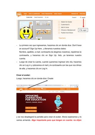 El documento proporciona instrucciones para crear un "Voki", que es una aplicación web que permite crear avatares parlantes. Explica los pasos para generar una cuenta, diseñar un avatar personalizado seleccionando características como la apariencia, ropa y fondo, grabar o escribir un mensaje de voz, y publicar el Voki compartiendo la URL. El objetivo es que los estudiantes puedan crear sus propios avatares animados para comunicarse en foros educativos.