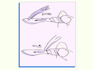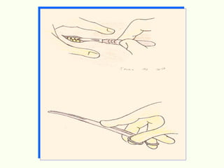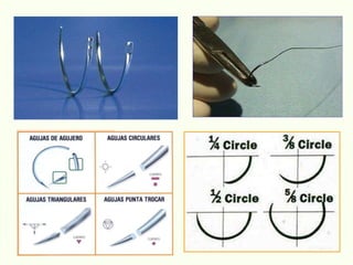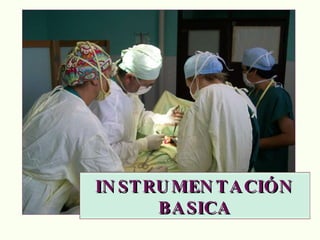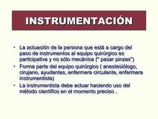 El documento proporciona información sobre la instrumentación quirúrgica. Describe que la persona a cargo de pasar los instrumentos al equipo quirúrgico forma parte integral del equipo y debe actuar de manera científica. También explica los diferentes tipos de instrumentos quirúrgicos, incluyendo aquellos para corte, prensión, separación, aspiración y sutura, así como sus características y usos. Además, brinda detalles sobre el manejo adecuado de los instrumentos y la importancia de seguir protocolos de aseps