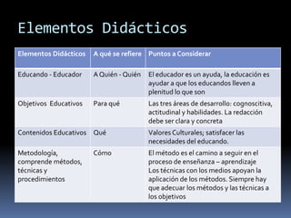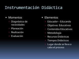 La instrumentación didáctica incluye momentos de diagnóstico, planeación, realización y evaluación. Los elementos clave son el educador, el educando, los objetivos educativos, contenidos, metodología, recursos, tiempos y lugar, y elementos didácticos que facilitan el proceso educativo.