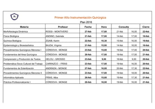 Este documento presenta el plan de estudios para el primer y segundo año de la carrera de Instrumentación Quirúrgica en 2016. En el primer año se incluyen asignaturas como Morfofisiología Dinámica, Física Biológica, Química Biológica, entre otras. En el segundo año se incluyen materias como Patología Quirúrgica, Farmacología, Micrbiología y Parasitología, entre otras. Para cada asignatura se detalla el profesor responsable, las fechas de consulta y c