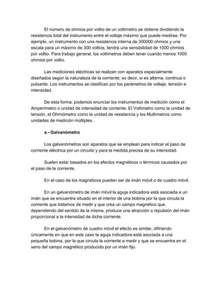 Los instrumentos de medición básicos incluyen amperímetros, voltímetros y ohmímetros, los cuales miden corriente eléctrica, voltaje y resistencia respectivamente. También existen multímetros que combinan estas funciones de medición en un solo instrumento analógico o digital. Otros instrumentos como galvanómetros, puentes de Wheatstone y contadores de servicio se utilizan para realizar mediciones eléctricas más precisas.