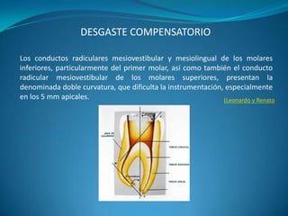 El documento describe varias técnicas de instrumentación de conductos radiculares. La técnica retrógrada involucra comenzar con instrumentos finos en el ápice y progresar hacia instrumentos más grandes. La técnica anterógrada comienza con instrumentos grandes en el orificio cervical y progresa hacia instrumentos más pequeños en el ápice. La técnica de retroceso involucra instrumentar un milímetro menos en cada pasada para crear una forma cónica. La técnica corono-apical comienza con instrumentos grandes en