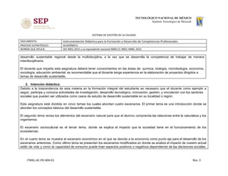Este documento presenta la instrumentación didáctica para una asignatura de Desarrollo Sustentable. La asignatura busca que los estudiantes adopten valores humanistas y actúen de forma sustentable en su práctica profesional. Se divide en cinco temas que cubren los escenarios natural, sociocultural, económico y modificado. El objetivo es formar ciudadanos conscientes de la justicia social y el cuidado ambiental.