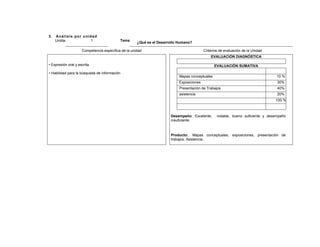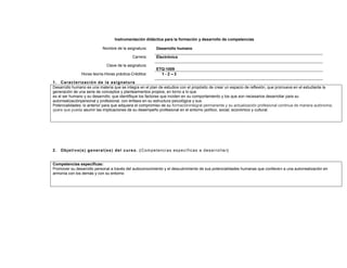 Este documento presenta la descripción de una asignatura de Desarrollo Humano para la carrera de Electrónica. La asignatura se divide en 5 unidades temáticas que abordan conceptos como el desarrollo personal, las potencialidades humanas, la superación personal, la autorrealización y los recursos para el equilibrio personal. Cada unidad incluye objetivos, criterios de evaluación, actividades de aprendizaje y enseñanza, y el desarrollo de competencias genéricas. El propósito de la asignatura es promover la reflexión sobre