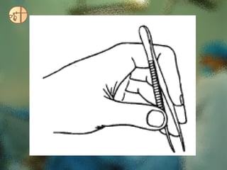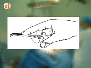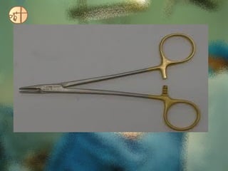 Este documento proporciona información sobre instrumental quirúrgico básico. Detalla diferentes tipos de tijeras, pinzas, separadores, agujas, materiales de sutura y su uso correcto. También describe instrumental laparoscópico como trocares, laparoscopios y cámaras. El objetivo es enseñar las técnicas y herramientas fundamentales de la cirugía.
