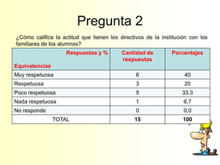 Este documento presenta los resultados de 3 encuestas realizadas a padres de familia sobre diversos aspectos de la calidad educativa de una institución. La mayoría calificó la actitud de los directivos como respetuosa y los aprendizajes de los estudiantes en las áreas básicas como muy buenos o buenos. También indicaron que sus hijos han cambiado positivamente en actitudes y comportamientos debido a la enseñanza de la institución.