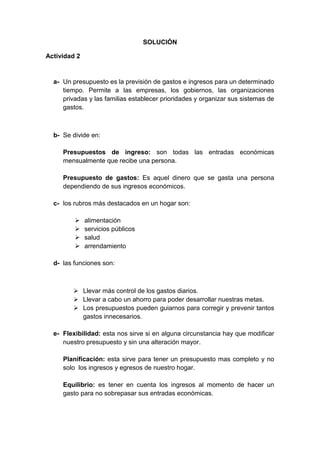 El documento habla sobre la importancia de los presupuestos para las familias, empresas y gobiernos. Explica que un presupuesto prevé los gastos e ingresos y permite establecer prioridades y organizar los gastos. Divide los presupuestos en ingresos, que son las entradas económicas mensuales, y gastos, en los que se gasta el dinero dependiendo de los ingresos. Algunos de los gastos más comunes son la alimentación, servicios públicos, salud y arrendamiento.