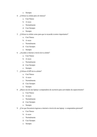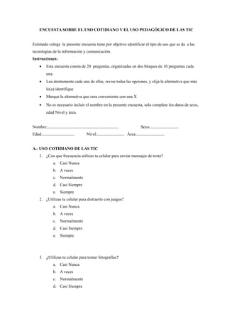 Este documento presenta una encuesta sobre el uso cotidiano y pedagógico de las tecnologías de la información y la comunicación (TIC). La encuesta consta de 20 preguntas divididas en dos secciones, la primera sobre el uso cotidiano de dispositivos como celulares y computadoras, y la segunda sobre el uso pedagógico de las TIC en el aula. Los encuestados deben indicar con qué frecuencia realizan diferentes actividades en cada categoría.