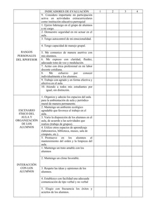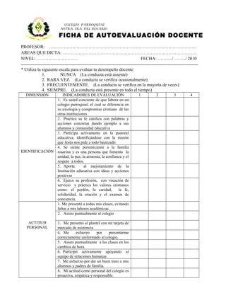 Este documento es una ficha de autoevaluación docente para profesores de un colegio parroquial. La ficha evalúa el desempeño docente del profesor en diferentes dimensiones como identificación, actitud personal, rasgos personales, escenario físico del aula, interacción con los alumnos, planificación y ejecución, recursos y evaluación. El profesor debe evaluarse a sí mismo en una escala del 1 al 4 en cada indicador. Al final, el profesor debe concluir si se considera un profesor regular, bueno,