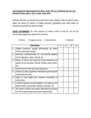 Este documento presenta un instrumento de diagnóstico para medir el nivel de cultura digital de los docentes de las instituciones educativas de la UGEL Chiclayo. El instrumento evalúa el uso de herramientas digitales de los docentes tanto en su vida cotidiana como en su labor pedagógica, a través de criterios como el uso de programas de Office, correo electrónico, redes sociales, la nube y recursos de Internet. El objetivo es medir qué tan frecuentemente los docentes usan estas herramientas digitales en aspect