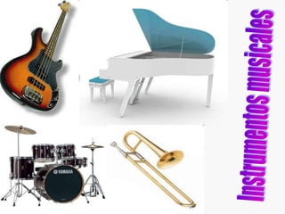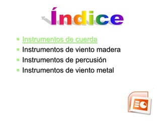 Este documento resume las cuatro familias principales de instrumentos musicales: cuerdas, viento madera, percusión y viento metal. Describe brevemente cada familia y cómo producen sonido, incluyendo que los instrumentos de cuerda usan cuerdas vibrando, los de viento madera originalmente eran de madera aunque ahora son de metal o plástico, los de percusión incluyen membranófonos e idiófonos percutidos de varias formas, y los de viento metal usan tubos de metal soplados.