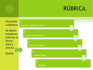 Este documento presenta diferentes instrumentos de evaluación como rúbricas, listas de cotejo, anecdotarios y proyectos. Explica los elementos clave de cada instrumento y ofrece ejemplos para ilustrar su aplicación.