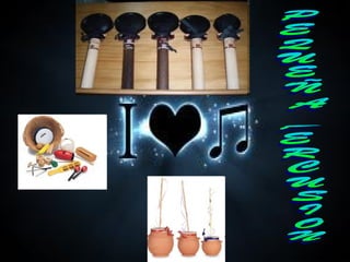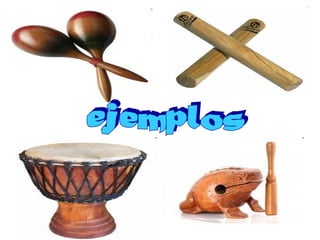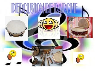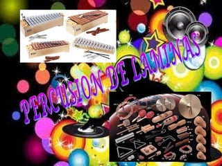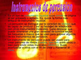 Este documento describe los instrumentos de percusión, que producen sonido al ser golpeados o agitados. Explica que la percusión puede crear ritmos o emitir notas musicales. Además, clasifica los instrumentos de percusión en dos categorías: de altura definida, que producen notas identificables; e indefinida, con notas de altura indeterminada. Finalmente, menciona las secciones de percusión en orquestas.