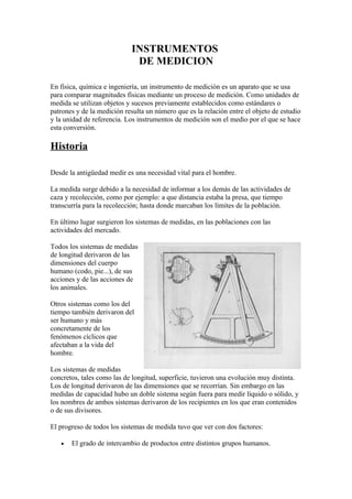 Este documento describe los instrumentos de medición y los tipos de errores que pueden ocurrir al medir. Explica que los instrumentos de medición permiten comparar magnitudes físicas desconocidas con unidades de medida establecidas. Luego, resume varios instrumentos comunes como reglas, metros, calibres y multímetros que se usan para medir longitudes y magnitudes eléctricas. Finalmente, clasifica los errores que pueden ocurrir debido al instrumento, el operador, factores ambientales u otros factores.