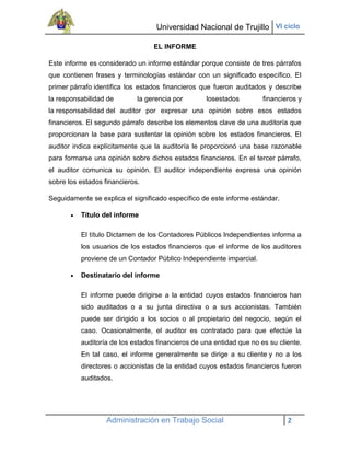 Este documento presenta información sobre un curso de Administración en Trabajo Social impartido en la Universidad Nacional de Trujillo. El curso es dictado por la docente Delia Veja Bazan Roncal en el sexto ciclo académico. Entre los integrantes del curso se encuentra Paola Terrones Julian. El documento también incluye información sobre estudios de tiempo y movimiento, informes y sus partes.