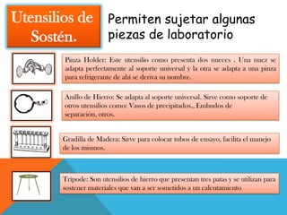 Este documento clasifica y describe los diferentes tipos de instrumentos de laboratorio, incluyendo utensilios de sostén como pinzas y trípodes, utensilios de uso específico como crisoles y embudos, utensilios volumétricos como matraces y buretas, recipientes como matraces Erlenmeyer, y aparatos como balanzas y medidores de pH.