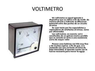 El documento describe diferentes instrumentos de medición eléctrica como el voltímetro, que mide la diferencia de potencial; el amperímetro, que mide la intensidad de corriente; el ohmímetro, que mide resistencias; el galvanómetro, que indica el paso de pequeñas corrientes; y el multímetro, que mide magnitudes eléctricas como voltaje, corriente y resistencia. También se mencionan el megóhmetro, que mide aislamiento eléctrico en alta tensión, y el frecuencímetro, que