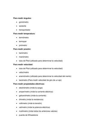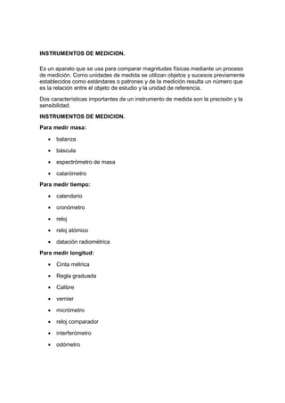 Los instrumentos de medición son aparatos que se utilizan para comparar magnitudes físicas mediante un proceso de medición. Miden cantidades como masa, tiempo, longitud, ángulos, temperatura, presión, velocidad y propiedades eléctricas. Dos características importantes de un instrumento de medición son la precisión y la sensibilidad. El documento luego enumera diversos instrumentos utilizados para medir diferentes tipos de cantidades físicas.