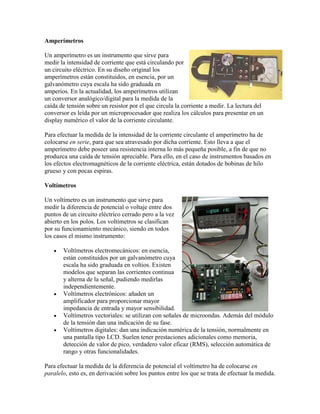 Los instrumentos de medida eléctrica más destacados son los amperímetros, voltímetros, óhmetros, multímetros y osciloscopios. Los amperímetros y voltímetros miden intensidad de corriente y diferencia de potencial respectivamente, mientras que los óhmetros miden resistencia eléctrica. Los multímetros permiten medir varias magnitudes en un solo aparato. Los osciloscopios representan gráficamente señales eléctricas que varían en el tiempo y permiten visualizar formas de onda.