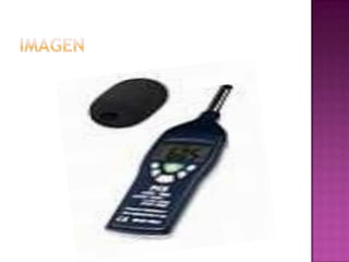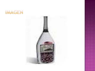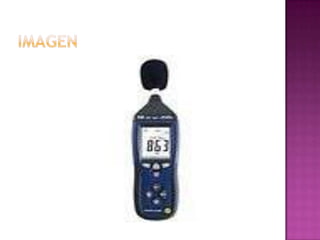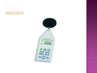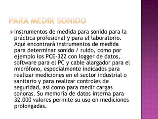 El documento habla sobre diferentes instrumentos de medida de sonido. Describe varios modelos, sus utilidades como medir ruido en industrias y su entorno, y características técnicas como rangos de medición, resolución, precisión e interfaz. Explica cómo algunos incluyen software, memoria interna y accesorios para realizar mediciones prolongadas de sonido en diversos ambientes de manera sencilla.