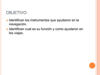 El documento describe varios instrumentos de navegación clave que ayudaron en los viajes, incluyendo el astrolabio para medir la posición de los cuerpos celestes, la brújula magnética y giroscópica para indicar el rumbo, el cuadrante que se usaba para medir la altura de los astros y determinar la latitud y hora, y la esfera armilar que mostraba las divisiones principales de los cielos y el movimiento de los cuerpos celestes. También menciona el nocturlabio, que