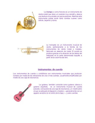 Este documento describe diferentes tipos de instrumentos musicales clasificados en tres familias: instrumentos de viento como el saxofón, flauta dulce y armónica; instrumentos de cuerda como la guitarra, violín y violonchelo; e instrumentos de percusión como la batería, cajón, tambor y conga. Explica brevemente las características de cada instrumento y cómo producen sonido.