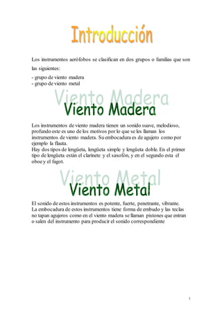 El documento clasifica los instrumentos de viento en dos grupos: de viento madera y de viento metal. Describe los principales instrumentos de cada grupo como el clarinete, oboe, fagot, flauta, saxofón, trompeta, tuba, trompa y trombón, detallando sus características, orígenes e historia.