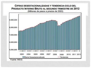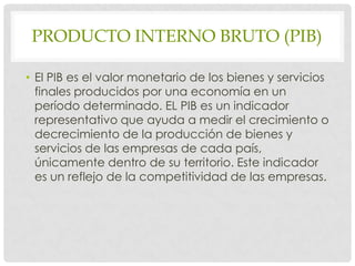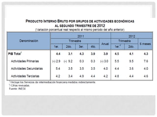 El documento explica conceptos económicos clave como el Producto Interno Bruto (PIB) y los instrumentos económicos. Define el PIB como la medida del valor de los bienes y servicios finales producidos en un país en un período. Explica que el PIB creció 0.87% en México en el segundo trimestre de 2012. También define los instrumentos económicos como herramientas que afectan los costos y beneficios de las decisiones económicas, como impuestos ambientales. Finalmente, discute modelos sobre el derecho de