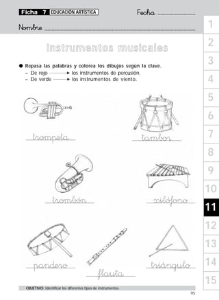 El documento habla sobre los diferentes tipos de instrumentos musicales. Identifica los instrumentos de percusión como timbales, pandero y triángulo, los cuales deben colorearse de rojo. También identifica los instrumentos de viento como flauta, trompeta y trombón, los cuales deben colorearse de verde. El objetivo es que los estudiantes identifiquen los diferentes tipos de instrumentos musicales.