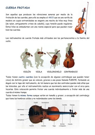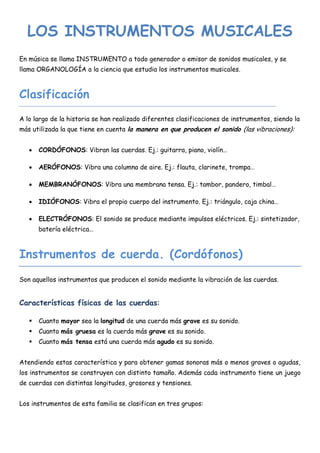 El documento clasifica y describe los principales tipos de instrumentos musicales. Explica que existen cinco categorías principales de instrumentos según cómo producen el sonido: cordófonos, aerófonos, membranófonos, idiófonos y electrófonos. Dentro de los cordófonos, describe los instrumentos de cuerda frotada como el violín, los de cuerda pulsada como la guitarra y el laúd, y los de cuerda percutida como el piano y el címbalo. También describe los aerófonos o instrumentos de viento