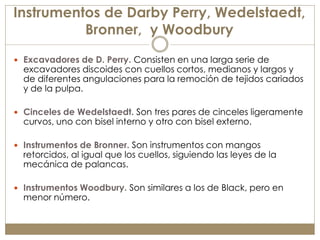 Los instrumentos descritos incluyen excavadores circulares para remover dentina, cinceles trapezoidales con mango grueso para compensar su desequilibrio, y recortadores de margen gingival en forma de escalón para alisar bordes.