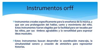 El documento clasifica y describe los principales tipos de instrumentos musicales utilizados en la enseñanza musical para niños pequeños según el Método Orff. Describe los instrumentos de percusión, viento y cuerda, dividiéndolos en subcategorías según sus características como la altura del sonido, los materiales y la forma de producir el sonido. El objetivo es desarrollar la coordinación, expresión musical y formación cultural de los estudiantes.