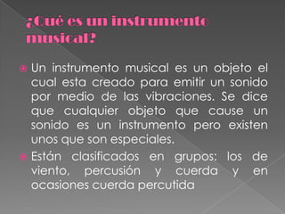 Este documento clasifica los principales tipos de instrumentos musicales en tres grupos: instrumentos de viento que producen sonido a través de la vibración de una columna de aire, instrumentos de percusión que producen sonido al golpearlos o agitarlos, e instrumentos de cuerda que producen sonido a través de la vibración de una o más cuerdas.