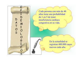 La insuficiencia cardiaca afecta a muchas personas mayores de 40 años. Cada año se registran 400,000 nuevos casos. Los factores de riesgo incluyen la edad, sobrepeso, diabetes, consumo de alcohol o cocaína, y presión arterial alta. Los síntomas incluyen aumento de peso, hinchazón, falta de aliento y fatiga. Existen diferentes tipos como la insuficiencia cardiaca derecha e izquierda.