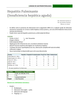 Este documento describe la hepatitis fulminante, una insuficiencia hepática aguda grave que se presenta en pacientes sin cirrosis o daño hepático crónico previo. Las causas más comunes son las hepatitis virales tipo A, B y E, así como también las drogas y tóxicos. Los síntomas incluyen alteración de la conciencia, vómitos persistentes y fenómenos hemorrágicos. Las complicaciones graves son la encefalopatía, infecciones, hemorragia y falla de otros órganos. El tratamiento involucra medicamentos antiv