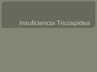 La insuficiencia tricúspidea puede ser funcional, debido a sobrecarga de presión en el ventrículo derecho, o orgánica, causada principalmente por dilatación del anillo tricuspideo. Provoca regurgitación sistólica, dilatación de cavidades derechas y congestión hepática. El tratamiento depende de si es funcional, resolviéndose al tratar la causa subyacente, u orgánica, requiriendo cirugía como plastia o reemplazo valvular.
